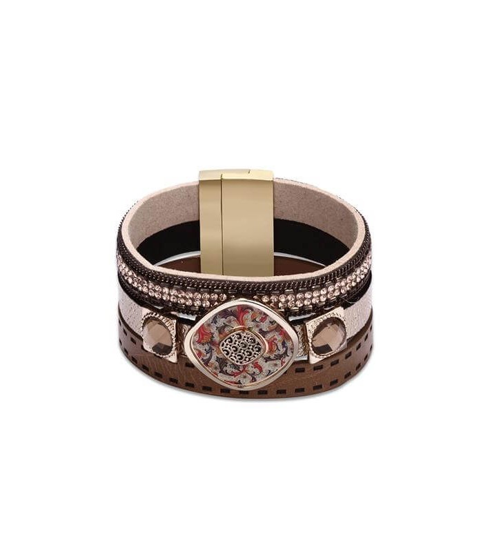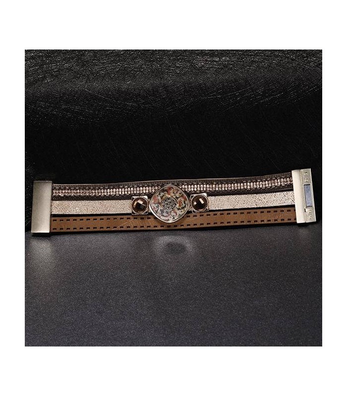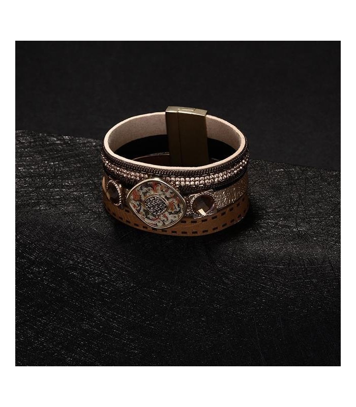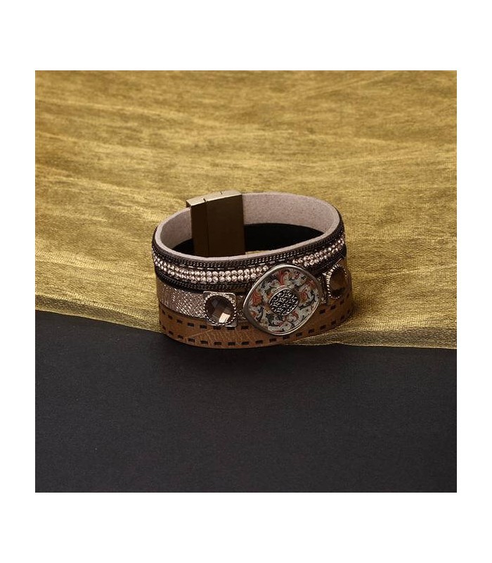 Műbőrből készült, különleges mintájú, kristályokkal díszített réteges karkötő, mágneses fém kapoccsal.