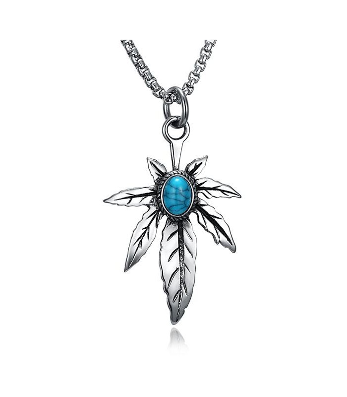 Antiallergén, kiváló minőségű nemesacélból készült cannabis medál, türkiz színű kővel díszítve.