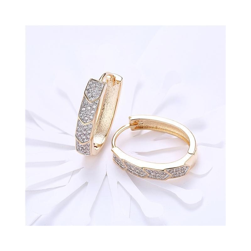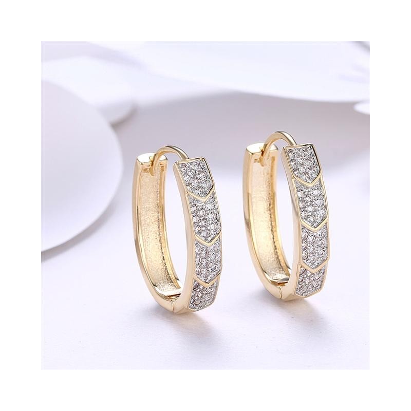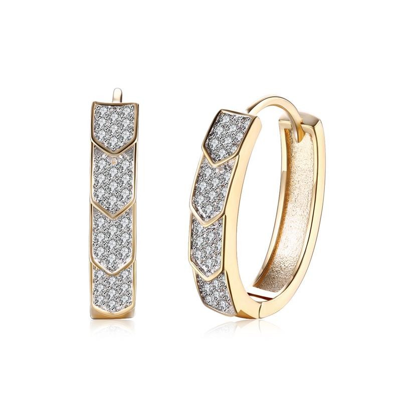 Különleges, ovális alakú fülbevaló, arany bevonattal, apró cirkónia kövekkel és nyíl mintával díszítve.