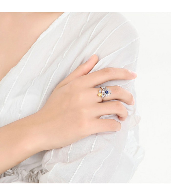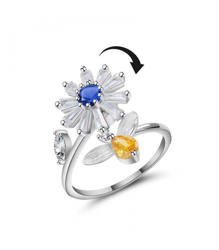 Csillogó, AAA minőségű cirkónia kristályok felhasználásával készült relax gyűrű. A virág 360 fokban pörgethető, ami nem csak szórakoztató, de nyugtató hatású is.