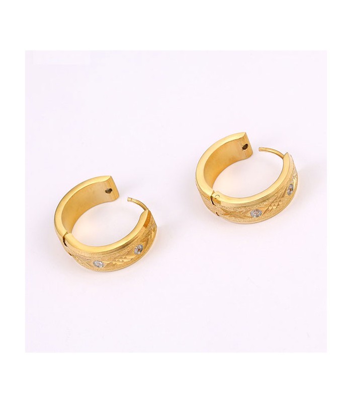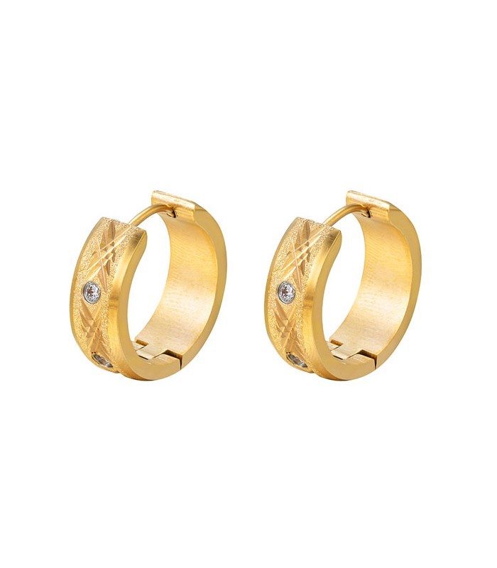 Nemesacél karika fülbevaló egyedi, vésett mintával és csillogó cirkónia kövekkel díszítve. Az ékszer csillogó-szemcsés felületű, arany bevonattal.
