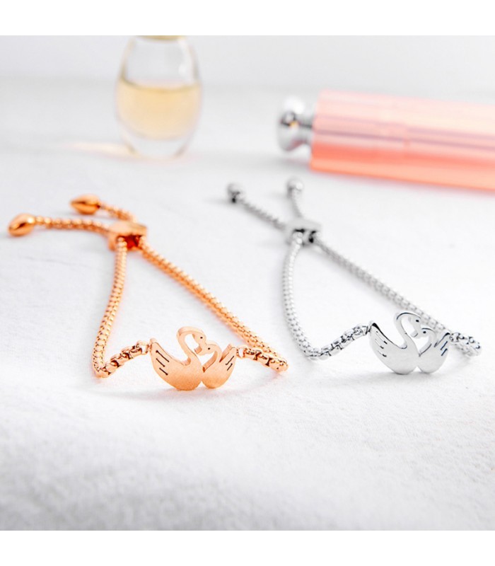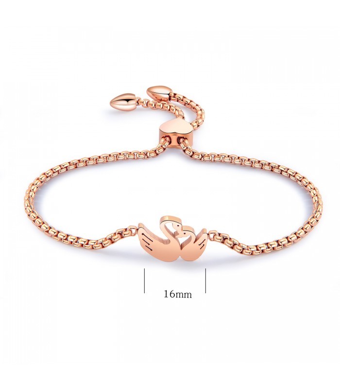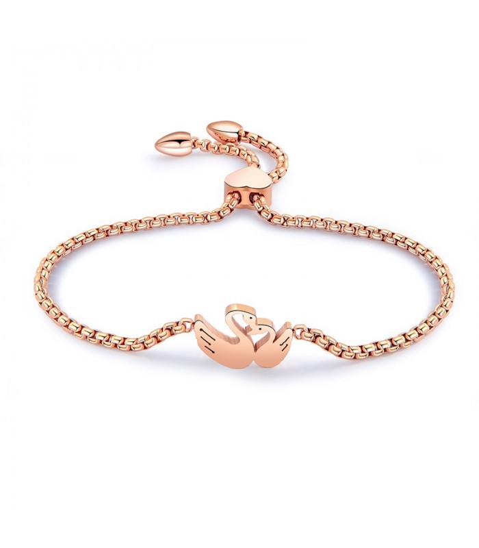 Kiváló minőségű, antiallergén 316L nemesacél karkötő, szerelmes hattyúpárt mintázó, romantikus dísszel, rendkívül tartós (PVD) rozé arany bevonattal. Mérete állítható a stílusos, szív alakú elemnek köszönhetően.