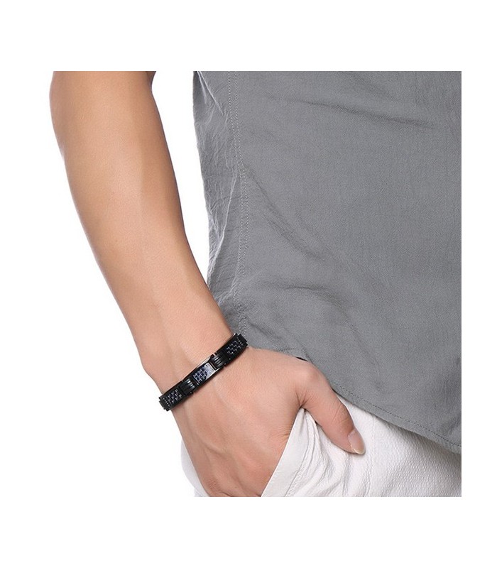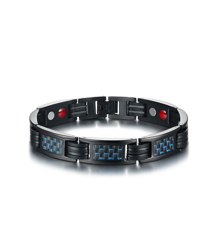 Prémium minőségű nemesacélból készült mágneses karkötő, stílusos, karbonszálas betéttel díszítve. A karkötő belső oldalán található ezüst pöttyök mágnesek, a fehérek negatív ionok, a feketék germánium, míg a pirosak távoli infrák.