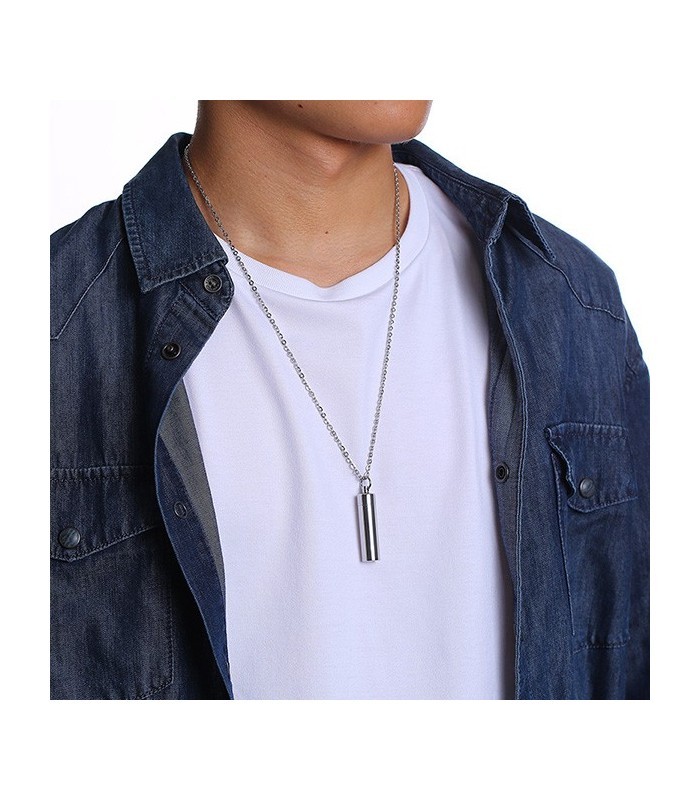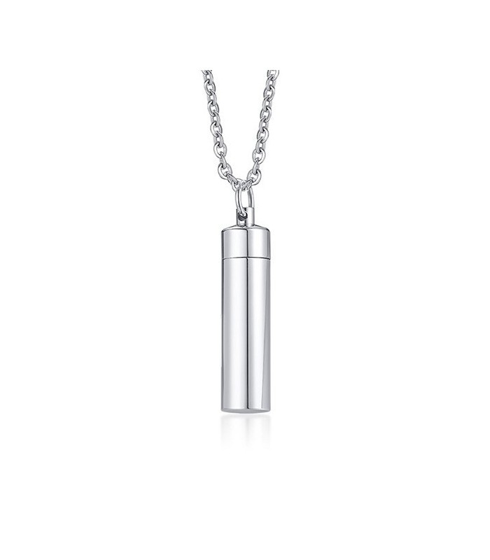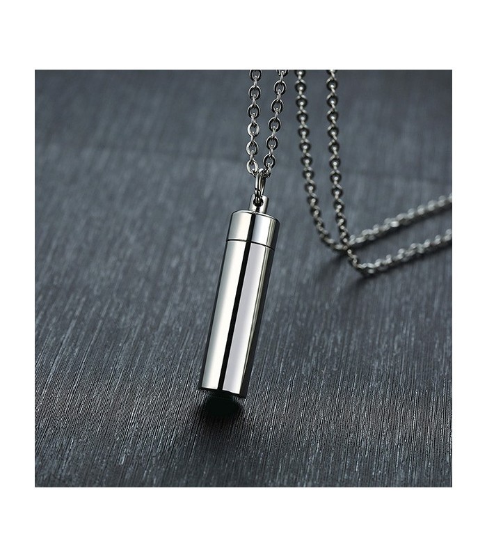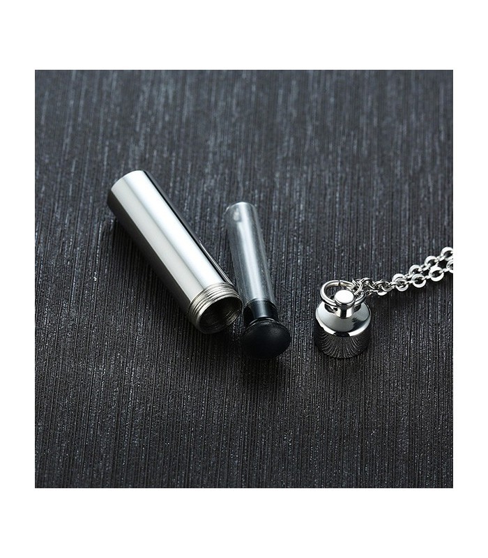 Kiváló minőségű, antiallergén nemesacélból készült, henger alakú, nyitható medál nyaklánccal. Az acél medál belseje üreges, szétcsavarható.
