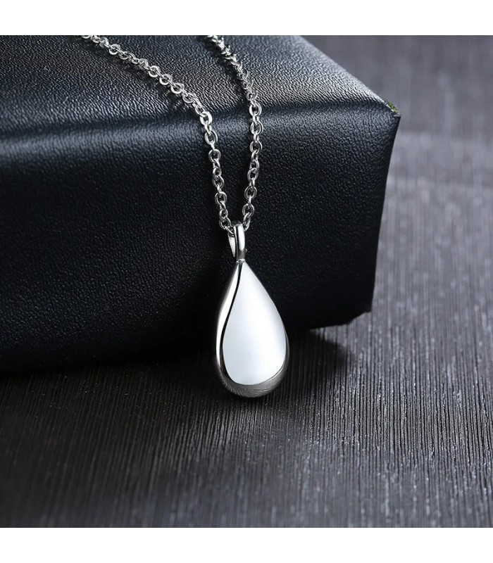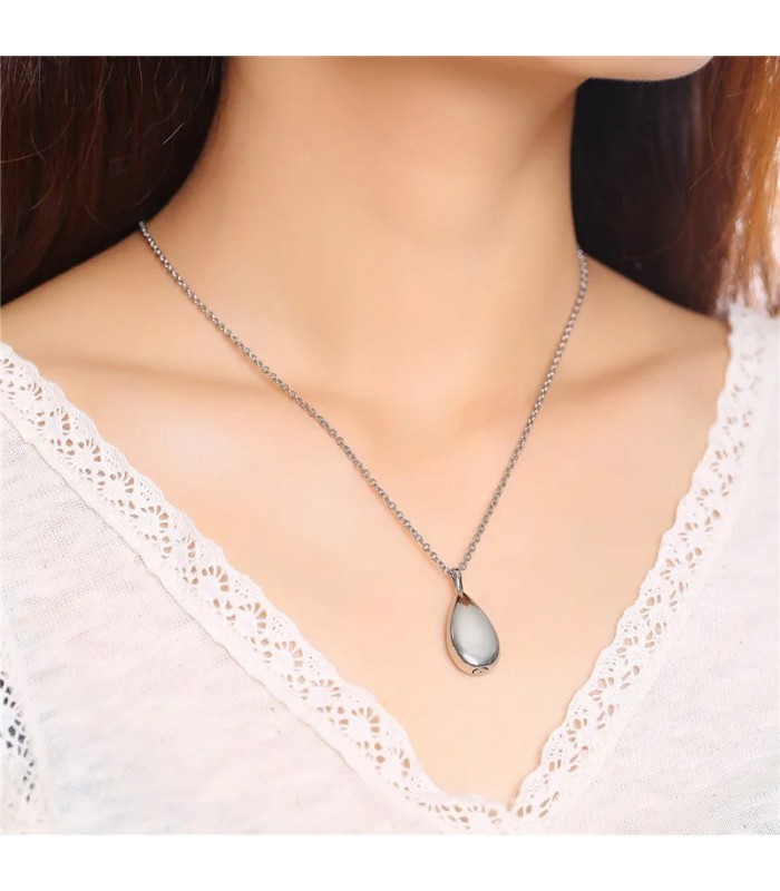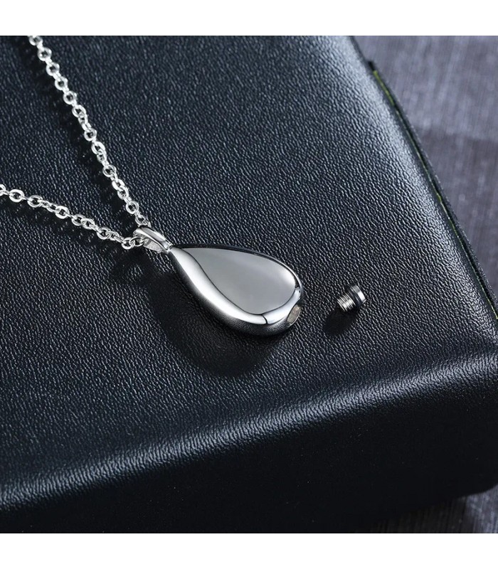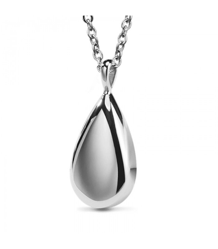 Antiallergén, kiváló minőségű nemesacélból készült, fényes felületű, csepp alakú, nyitható kegyeleti medál nyaklánccal.